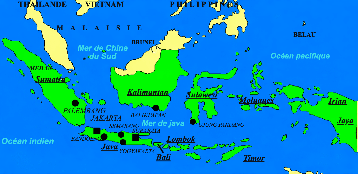 L'Indonésie est constituée d'une multitude d'îles. On en dénombrerait 17 500. Chacune des principales îles a connu son propre trajet historique et ce n'est qu'à son indépendance en 1949 que l'archipel fut réellement réuni.