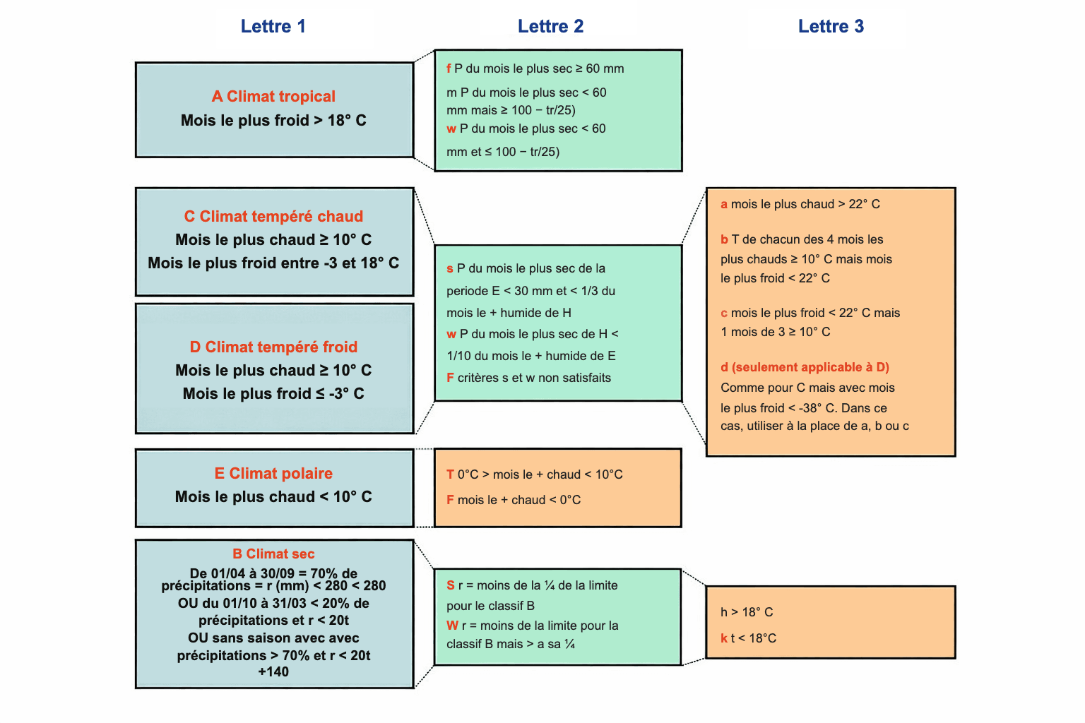 Le système utilise cinq (une sixième a été rajoutée après la création de la classification) lettres pour diviser le monde en cinq (six) régions climatiques principales basées sur les précipitations annuelles moyennes, les précipitations mensuelles moyennes et les températures annuelles moyennes. Cette première lettre donne le type de climat.