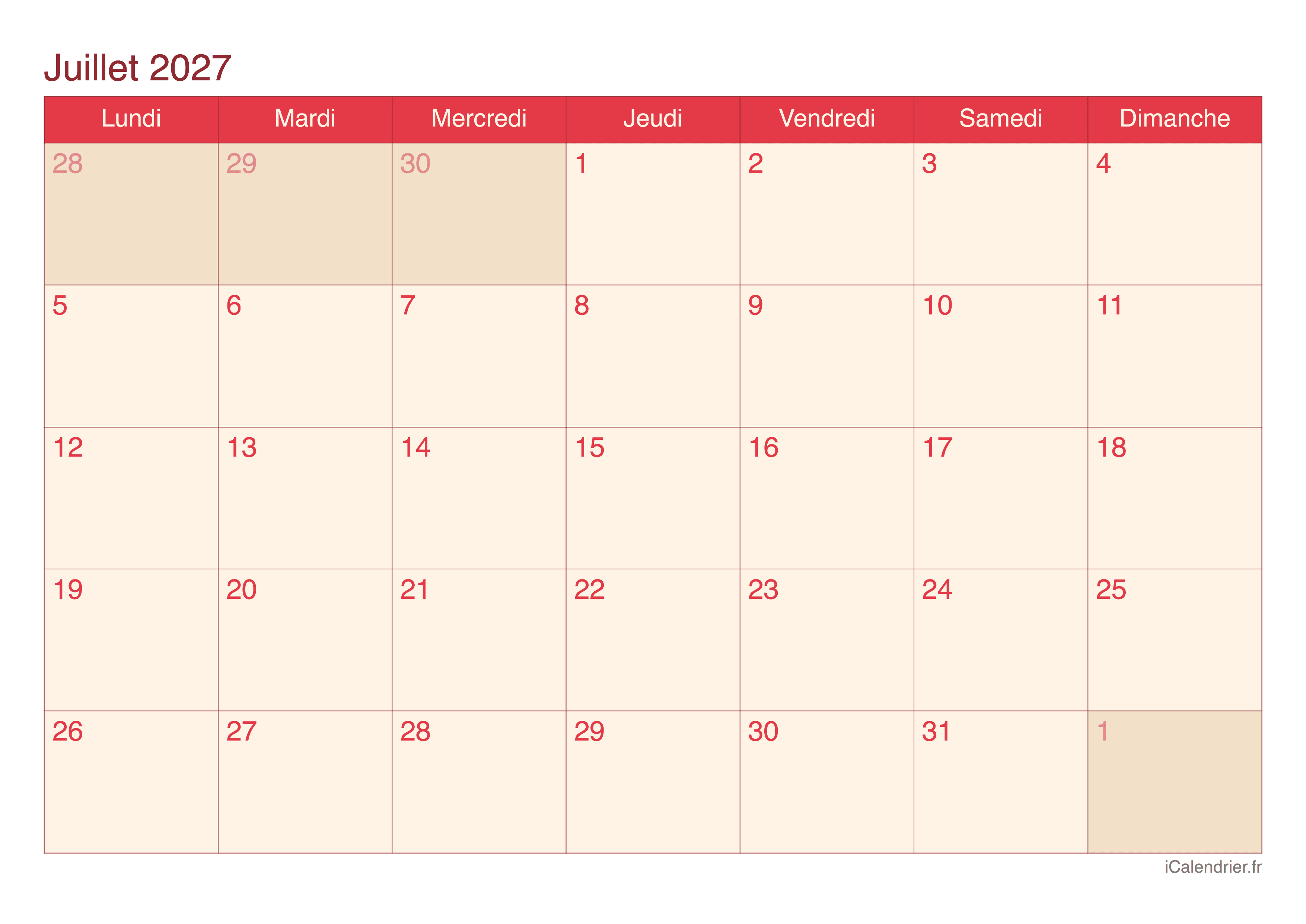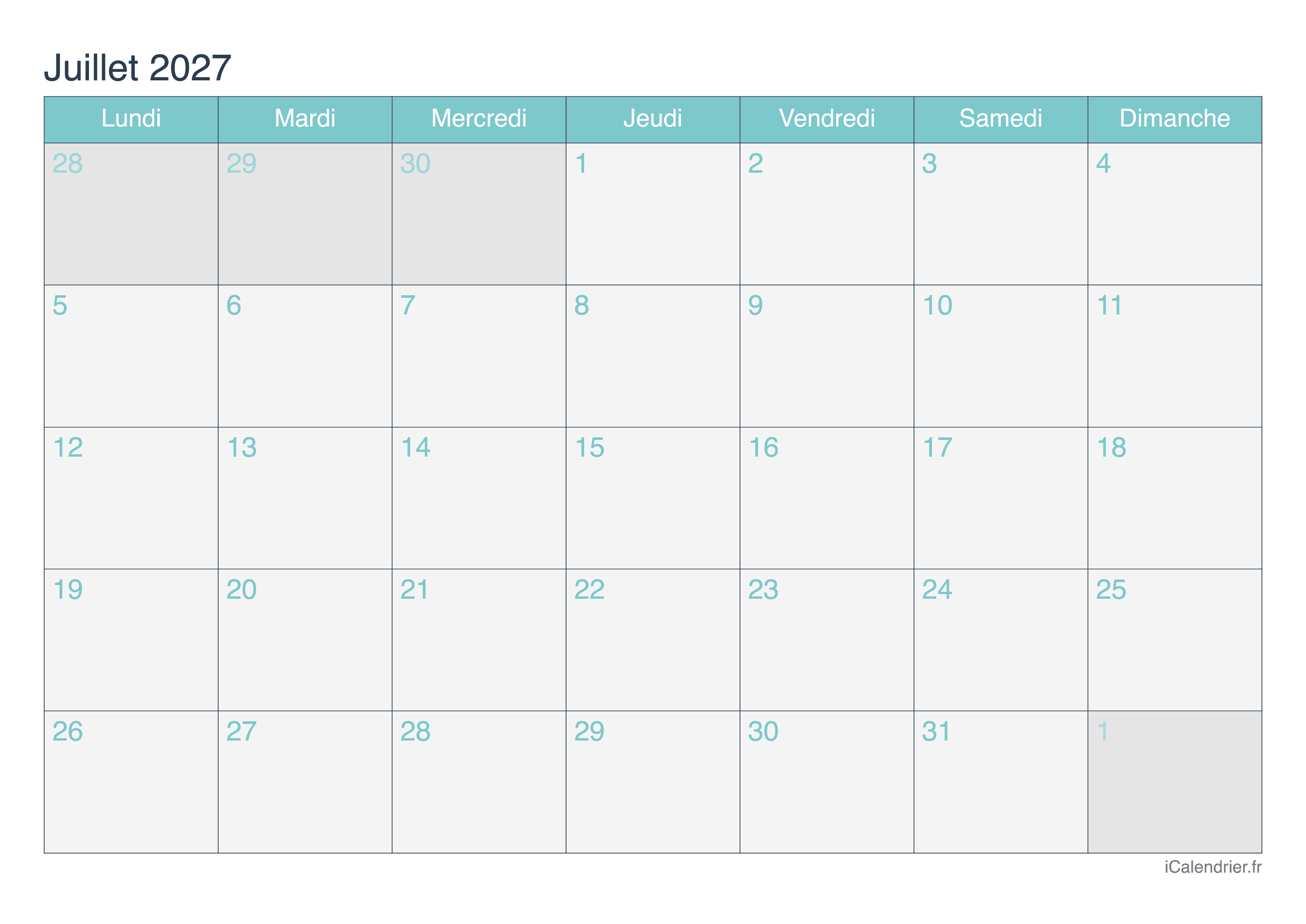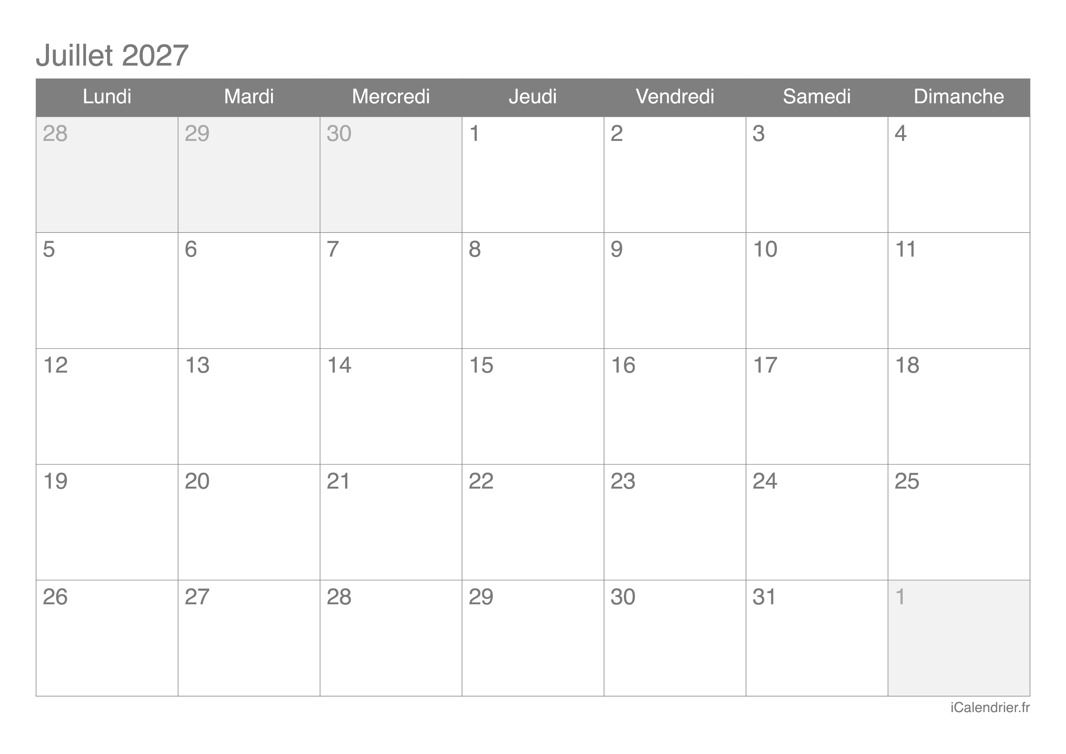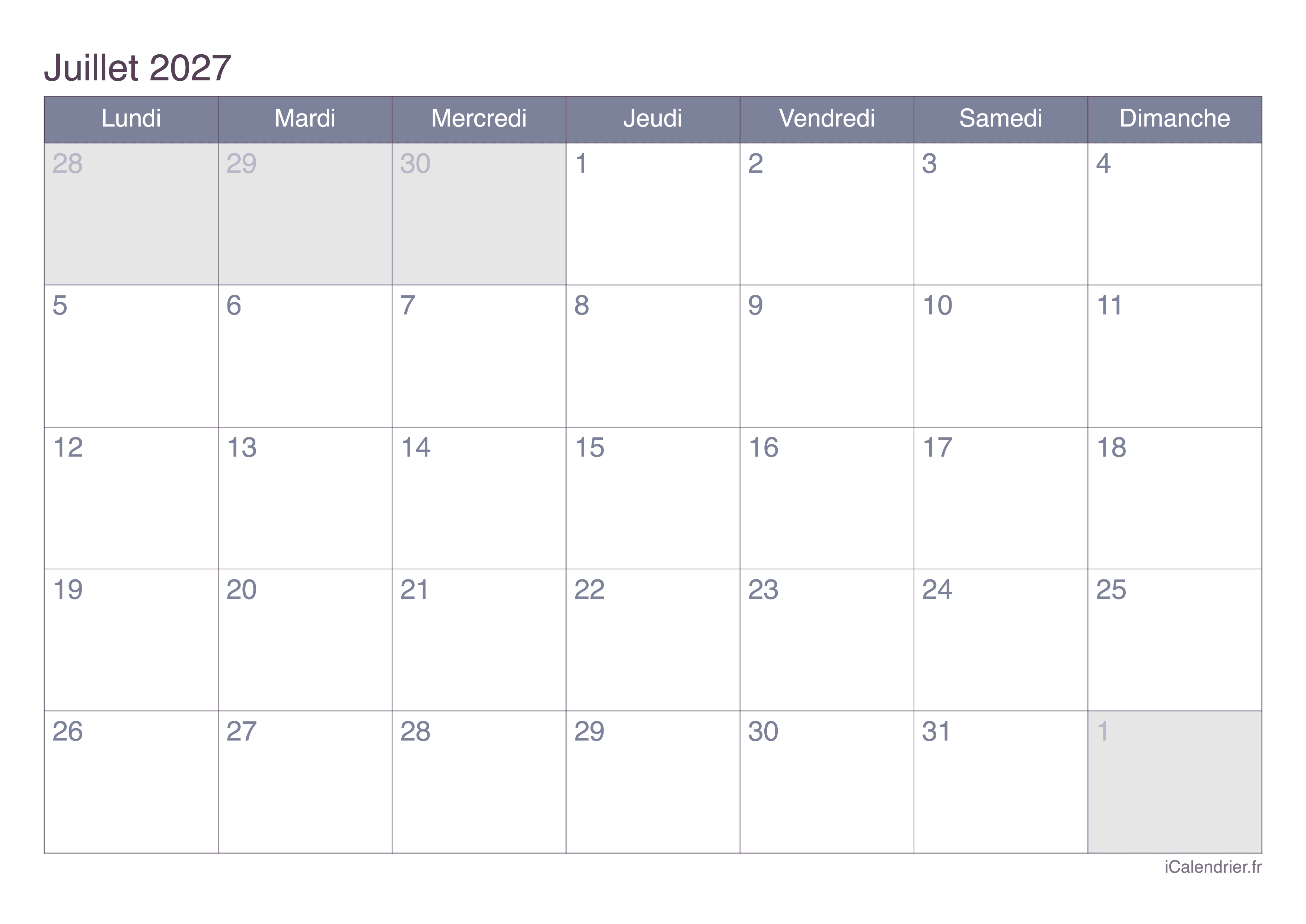 Calendrier de juillet 2027 à imprimer