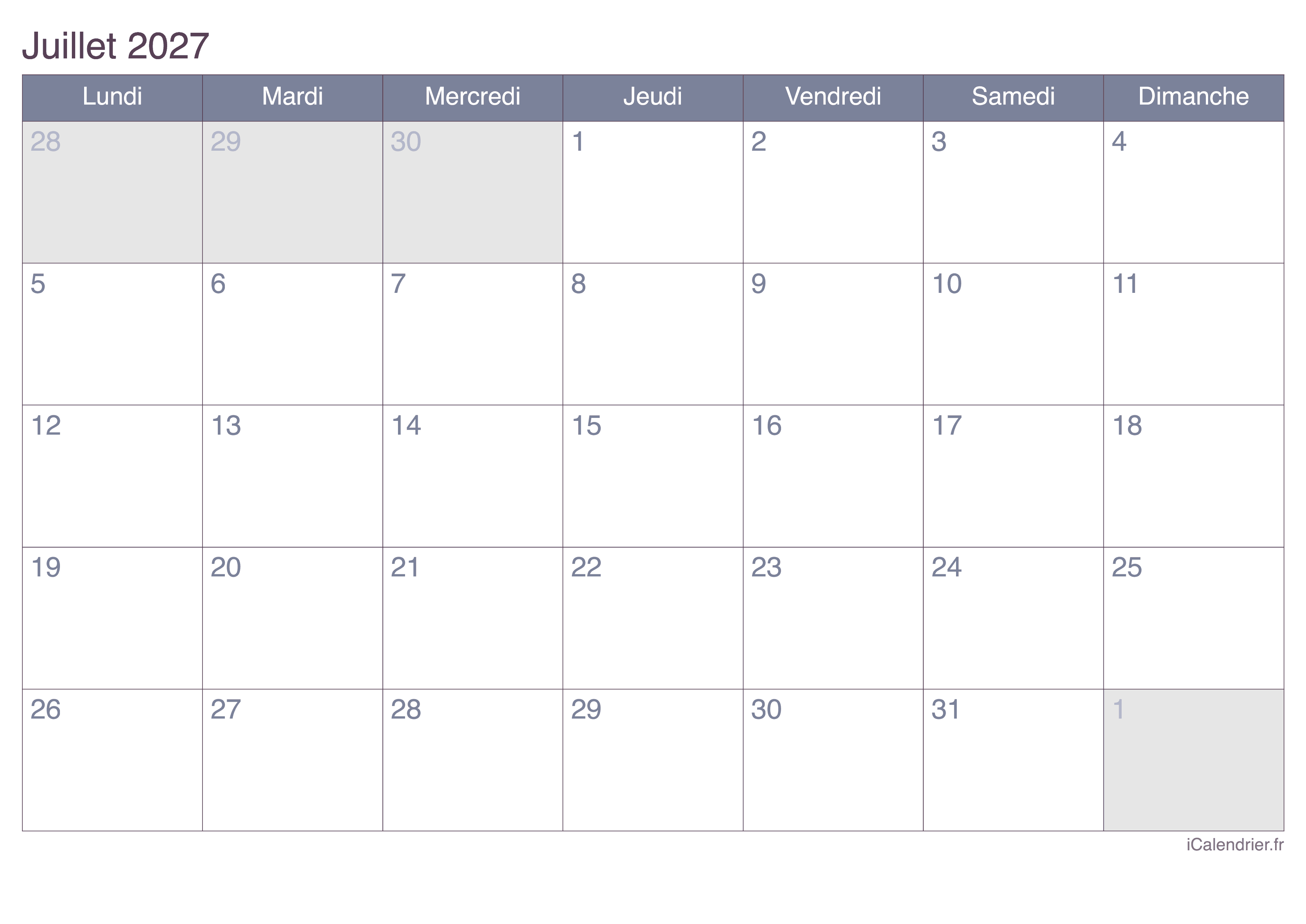 Vous pouvez télécharger et imprimer librement le calendrier de juillet 2027 vierge aux formats image, PDF et Excel. Retrouvez également d'autres thèmes de calendrier 2027 pour le mois de juillet.