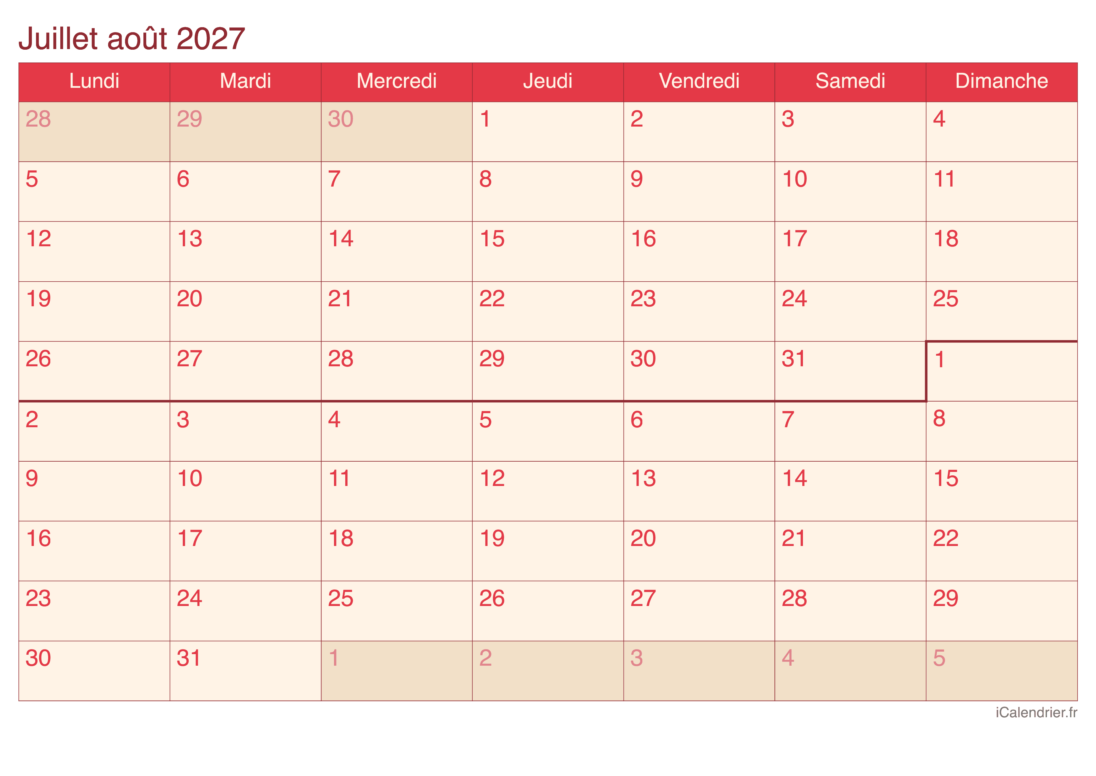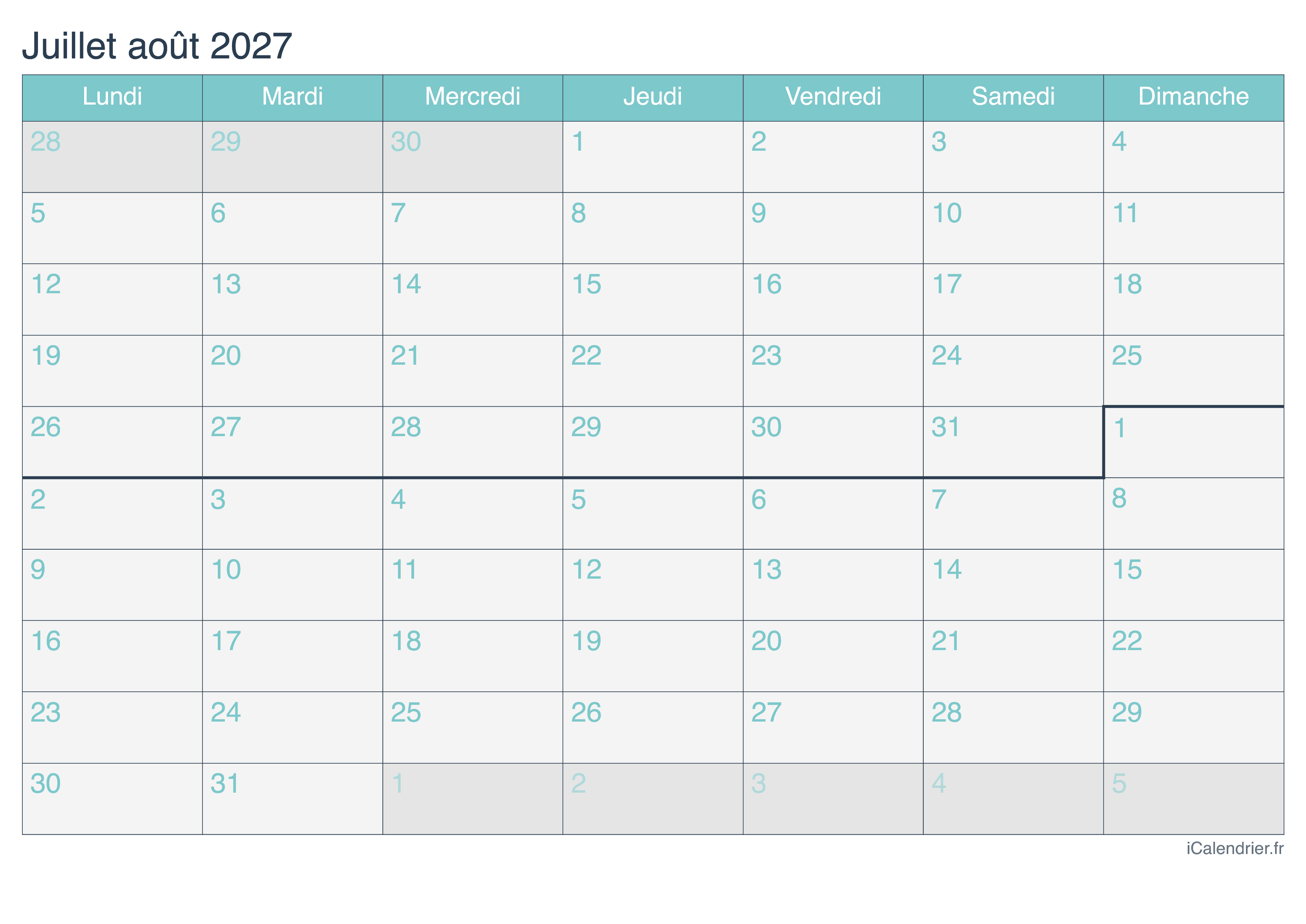 Calendrier de juillet et août 2027 à imprimer