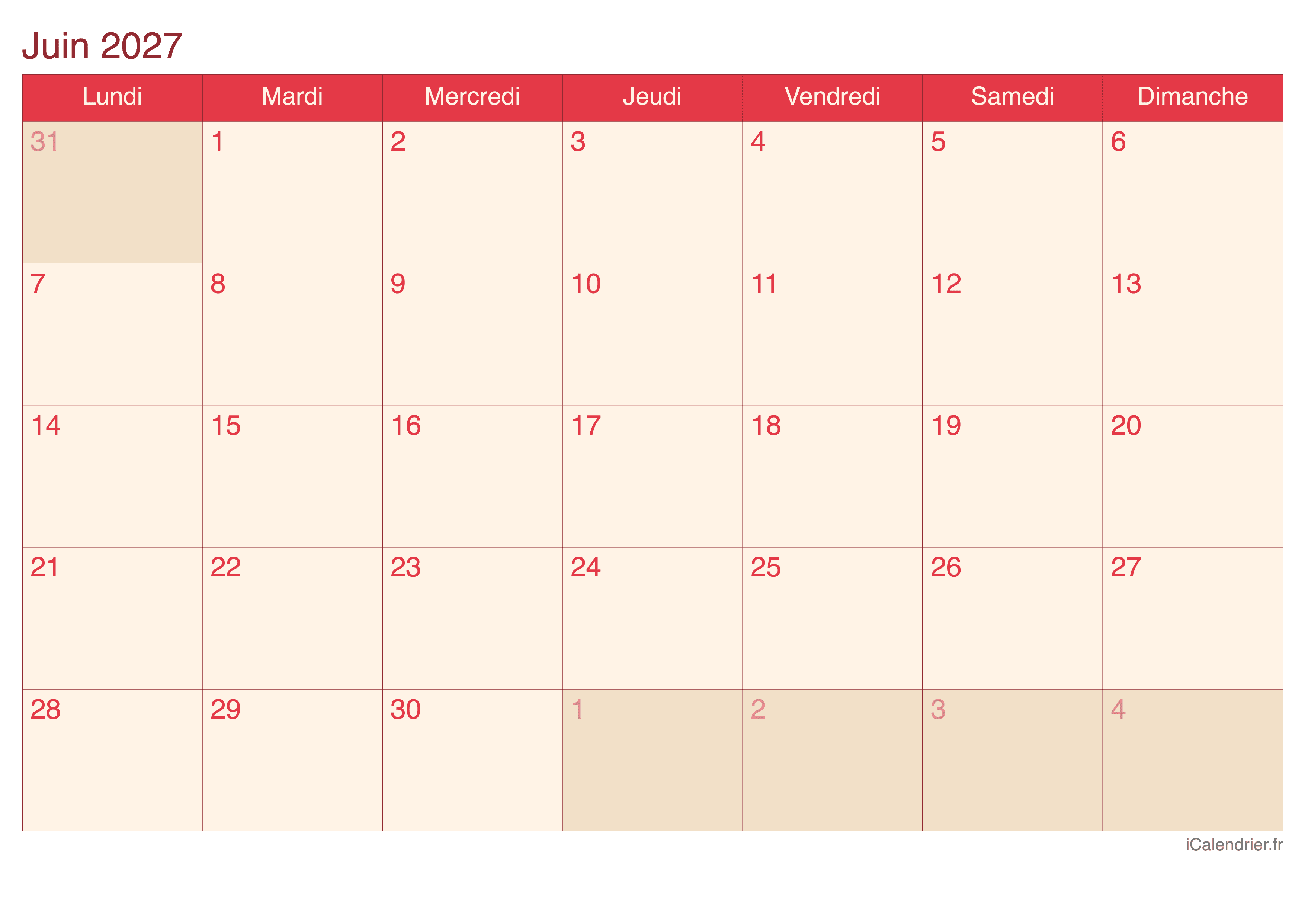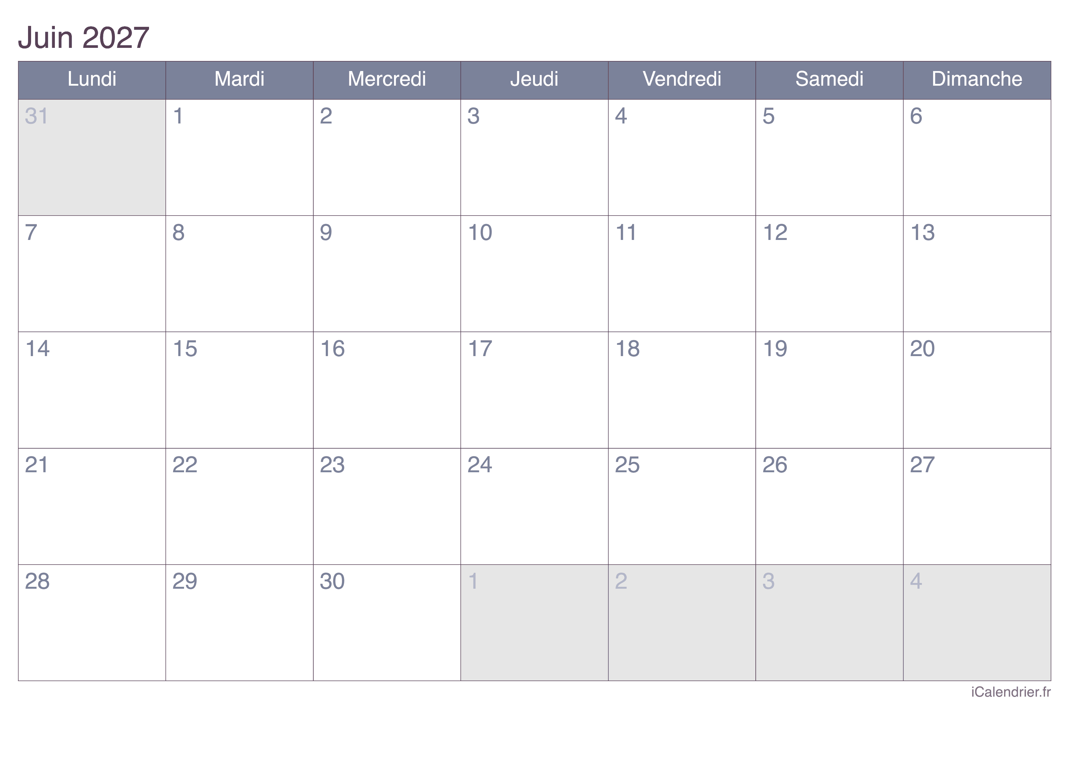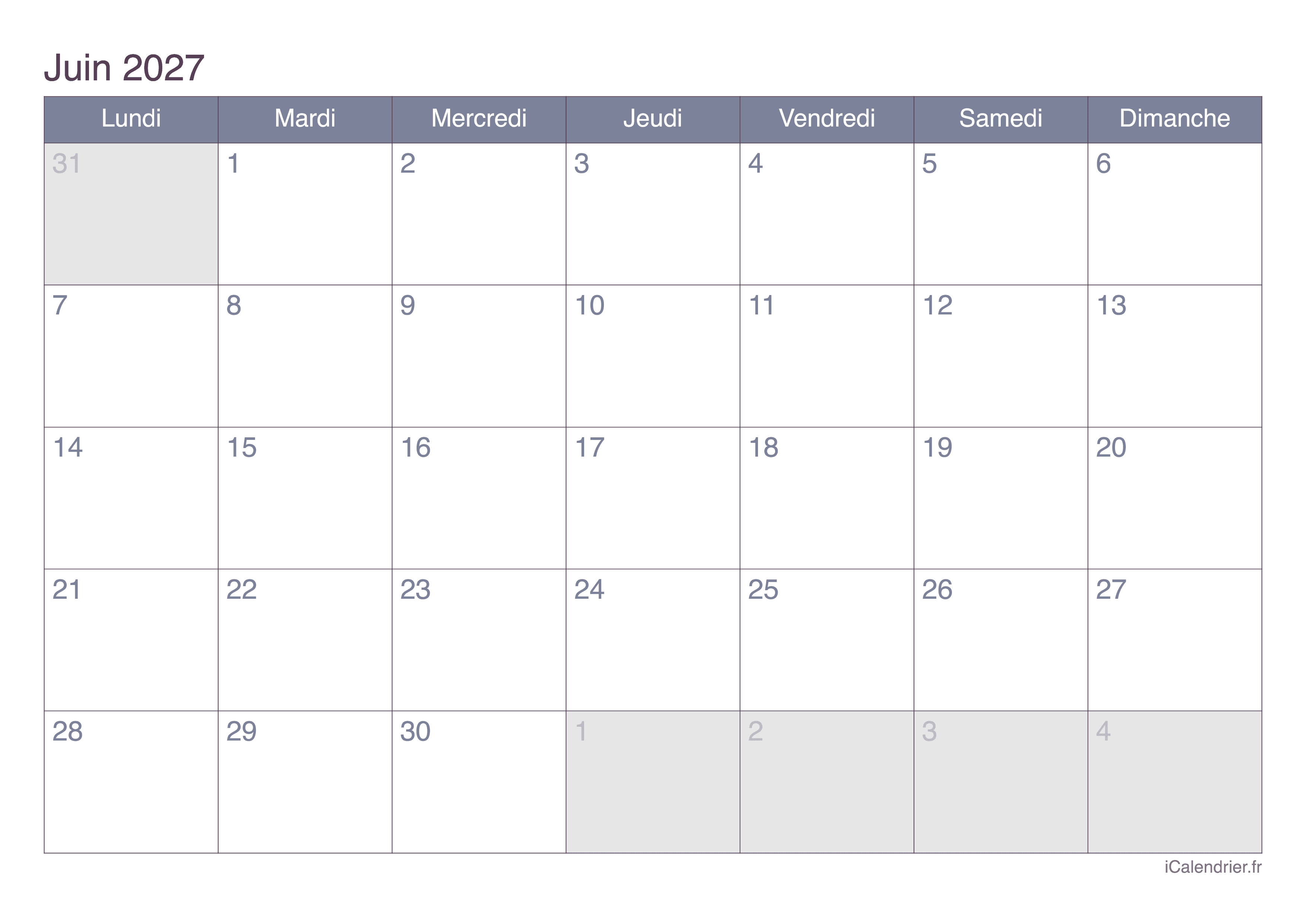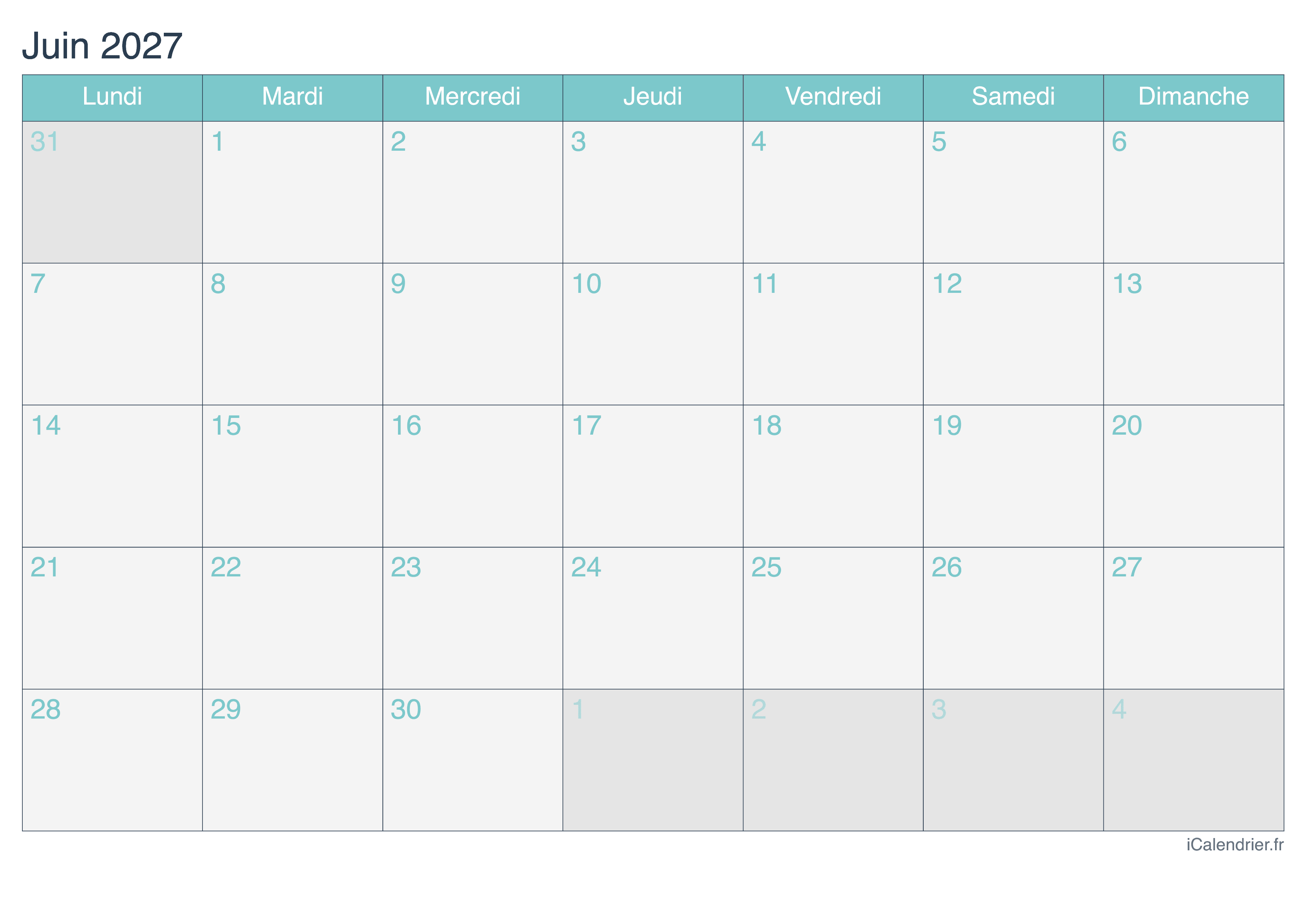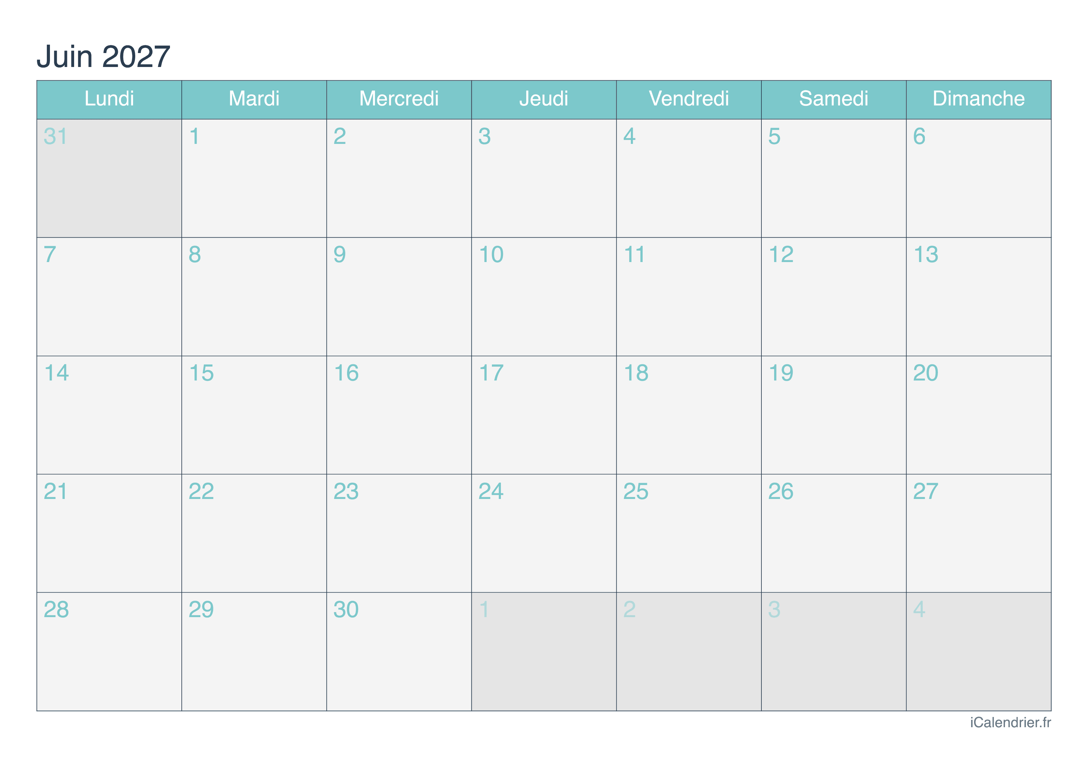 Vous pouvez télécharger et imprimer librement le calendrier de juin 2027 vierge aux formats image, PDF et Excel. Retrouvez également d'autres thèmes de calendrier 2027 pour le mois de juin.