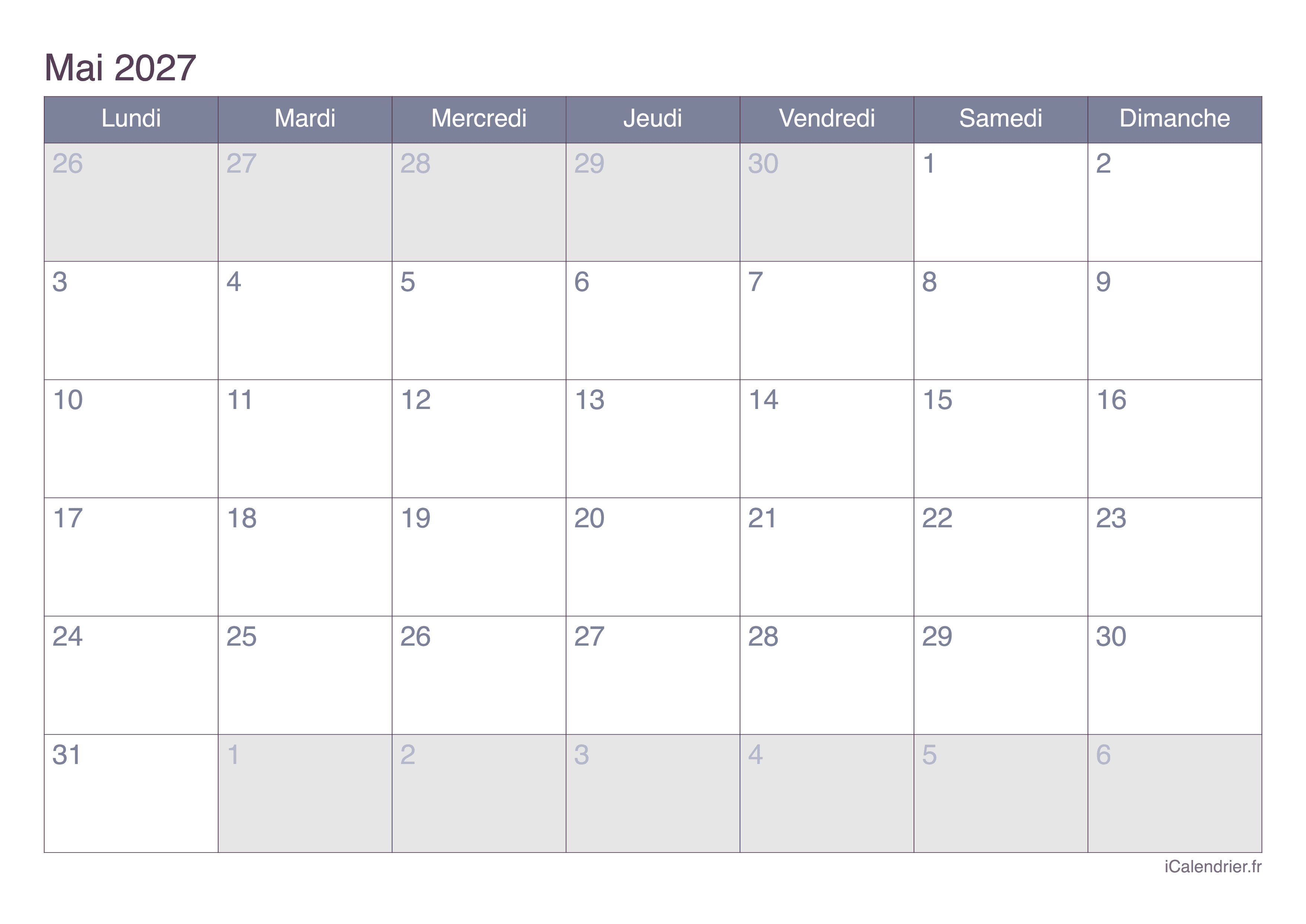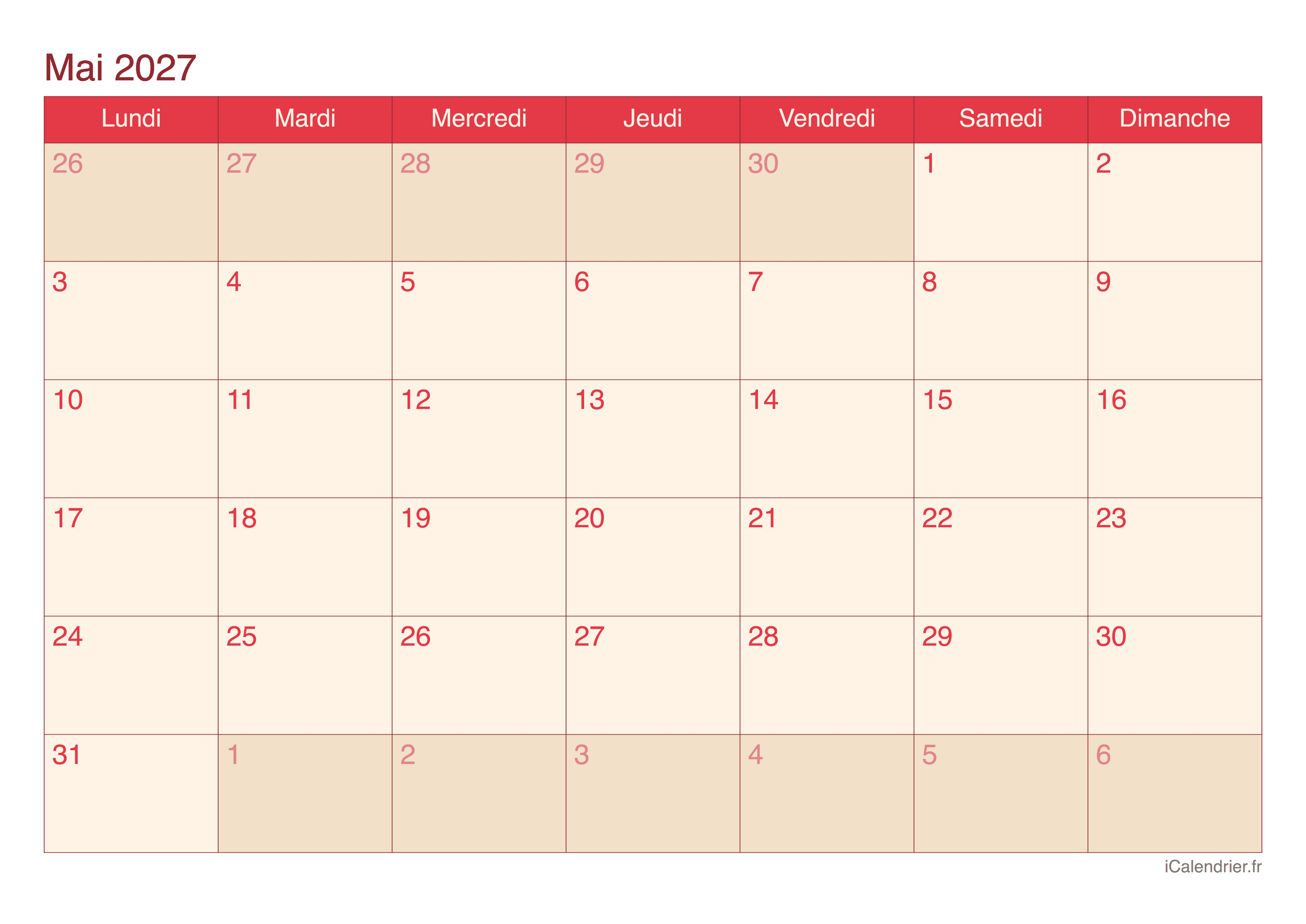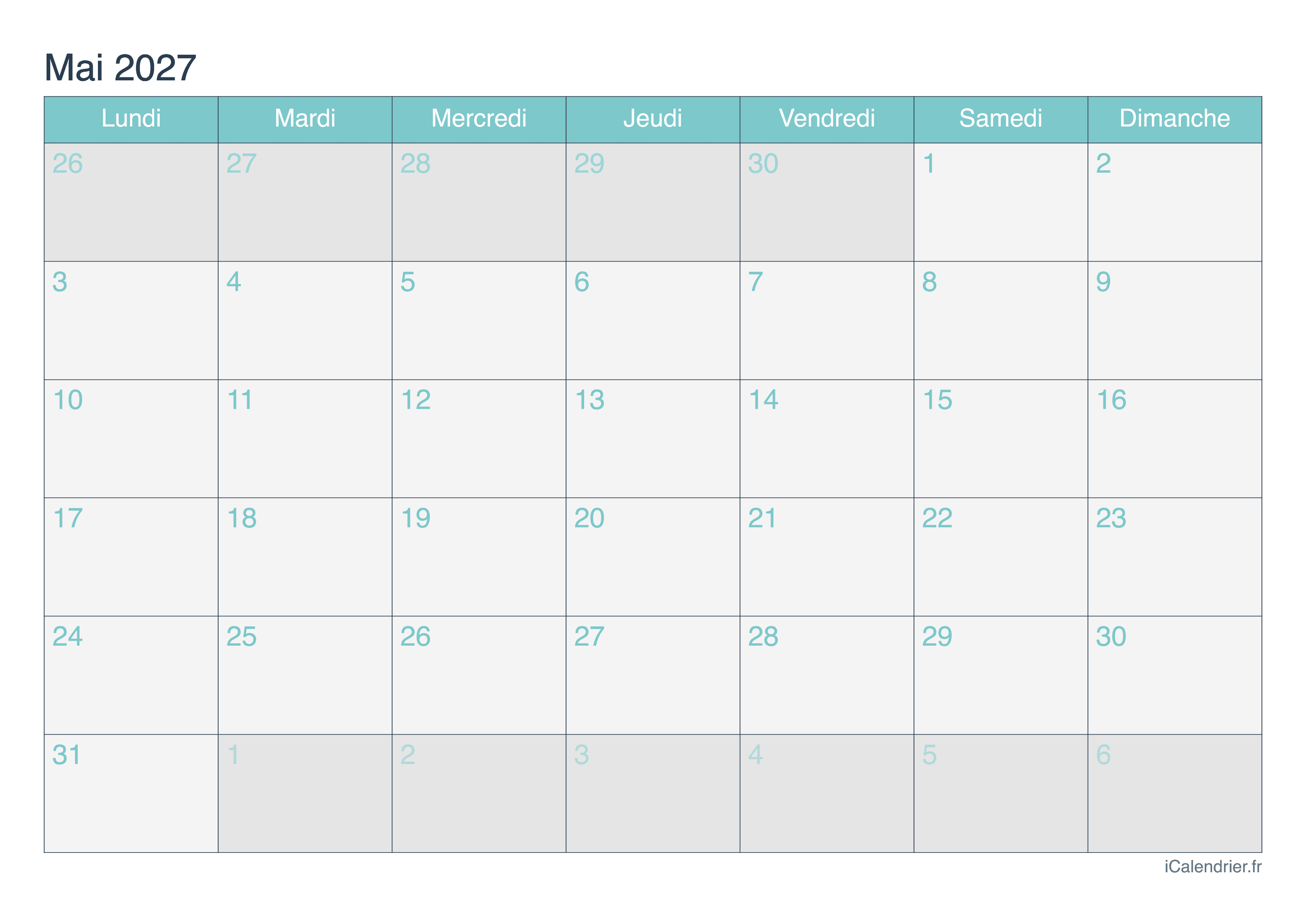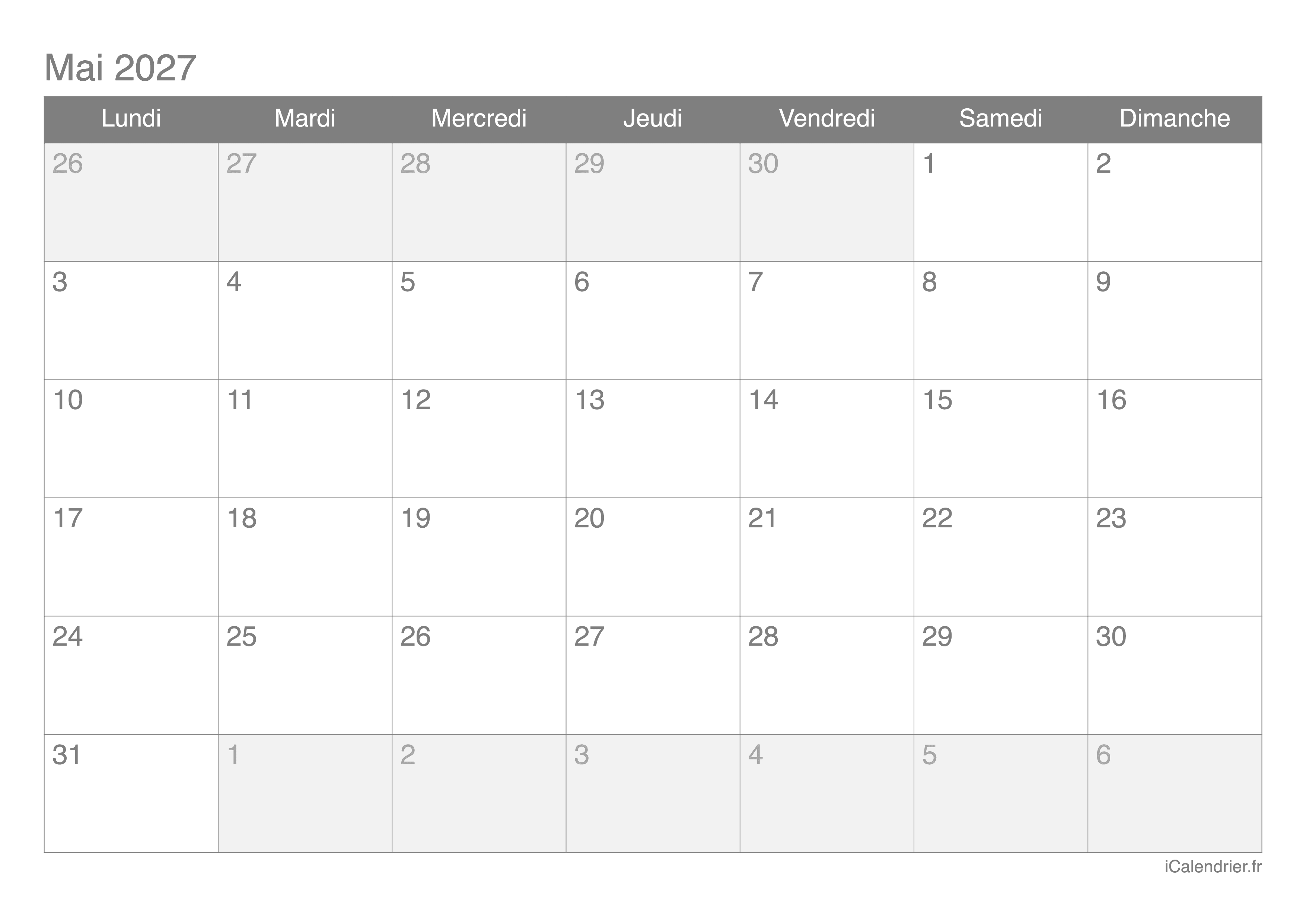 Vous pouvez télécharger et imprimer librement le calendrier de mai 2027 vierge aux formats image, PDF et Excel. Retrouvez également d'autres thèmes de calendrier 2027 pour le mois de mai.