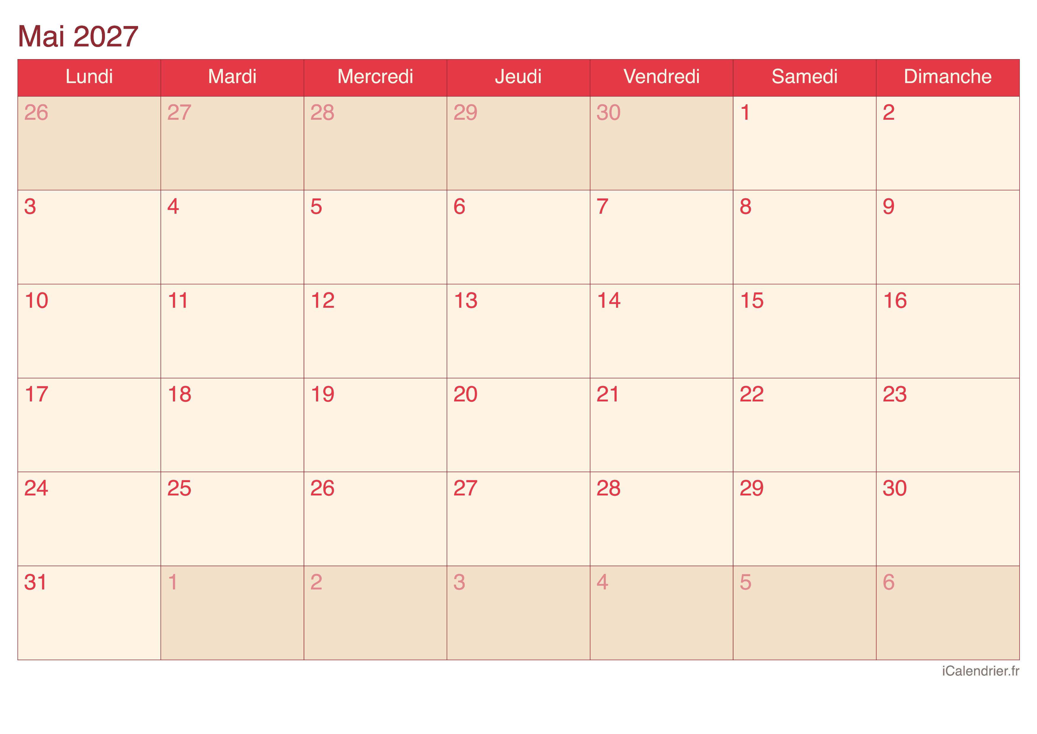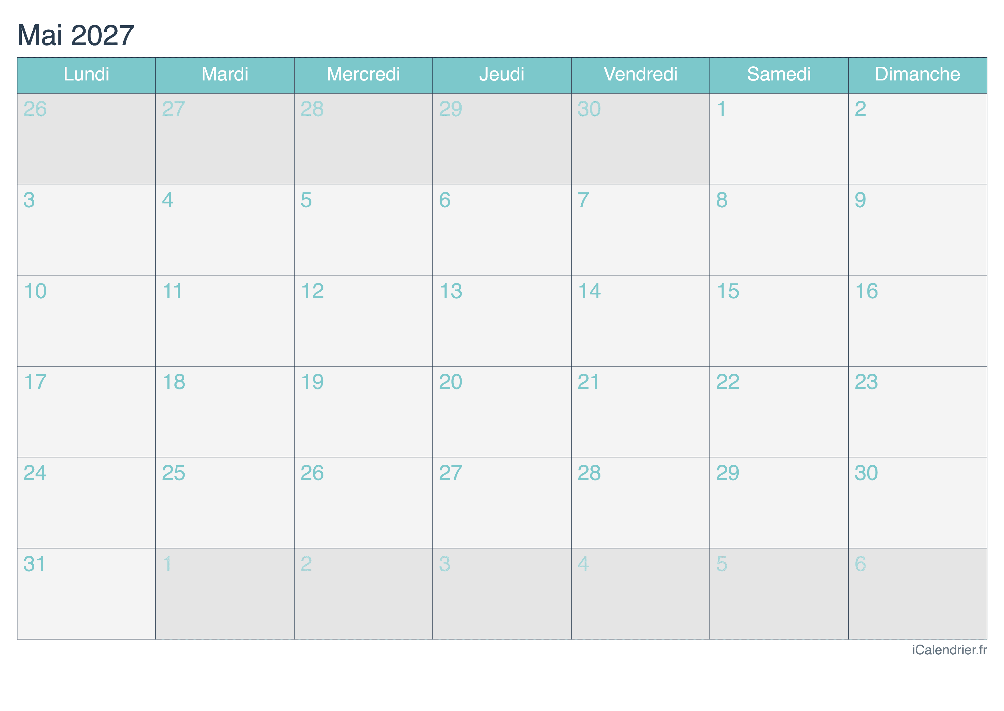 Calendrier de mai 2027 à imprimer