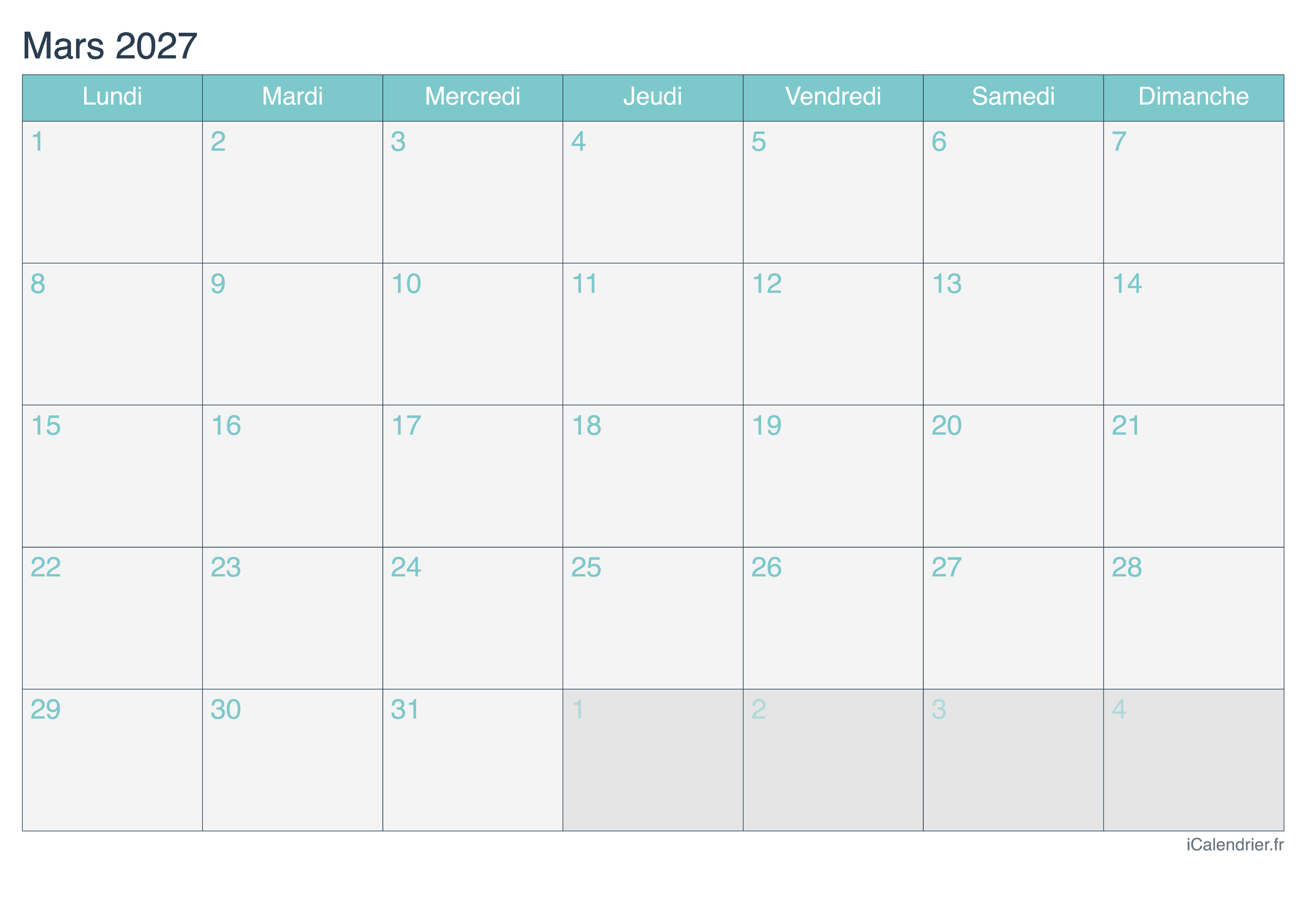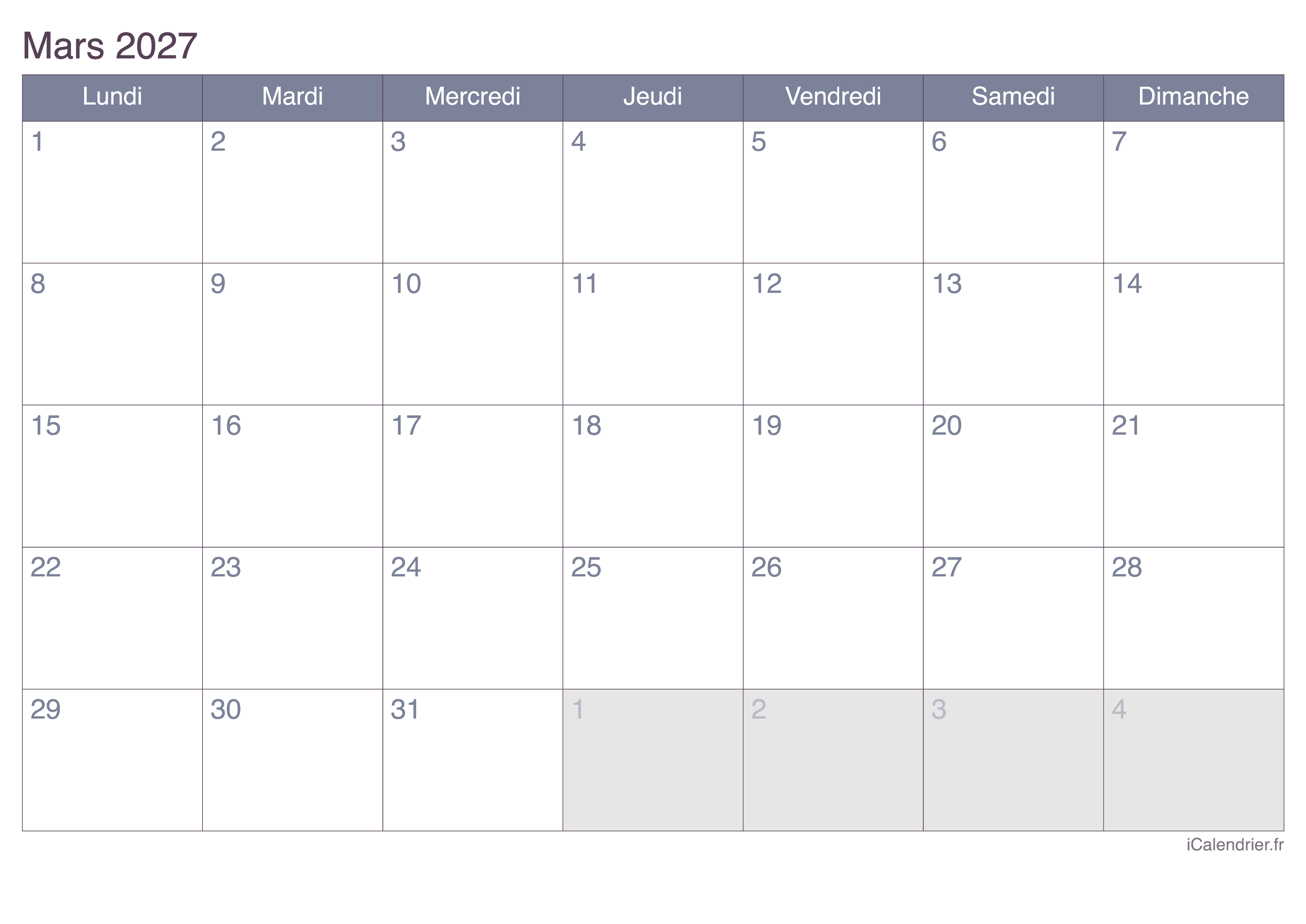 Calendrier de mars 2027 à imprimer