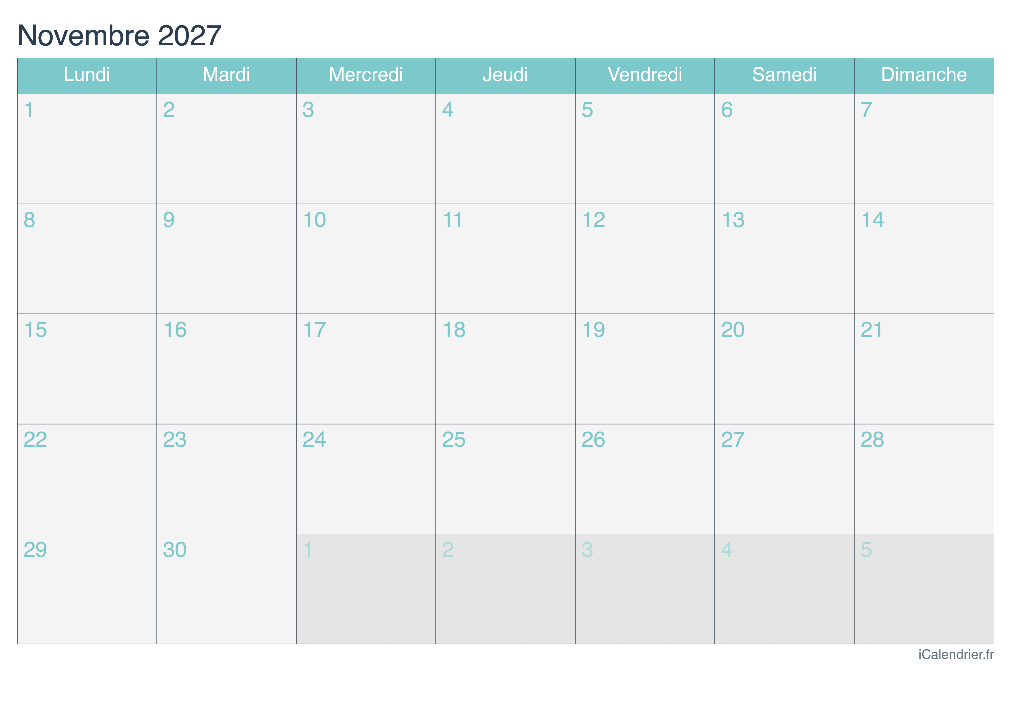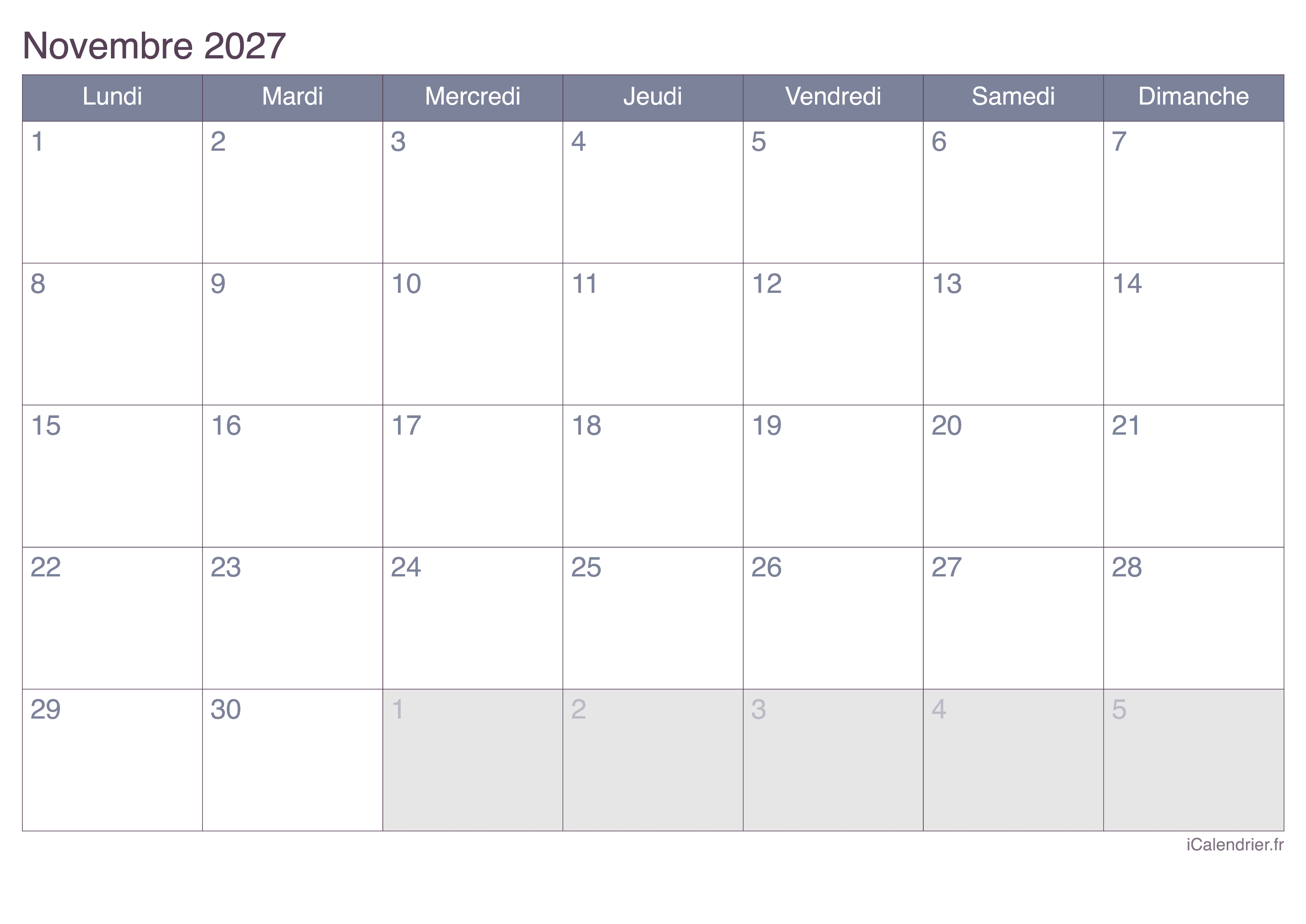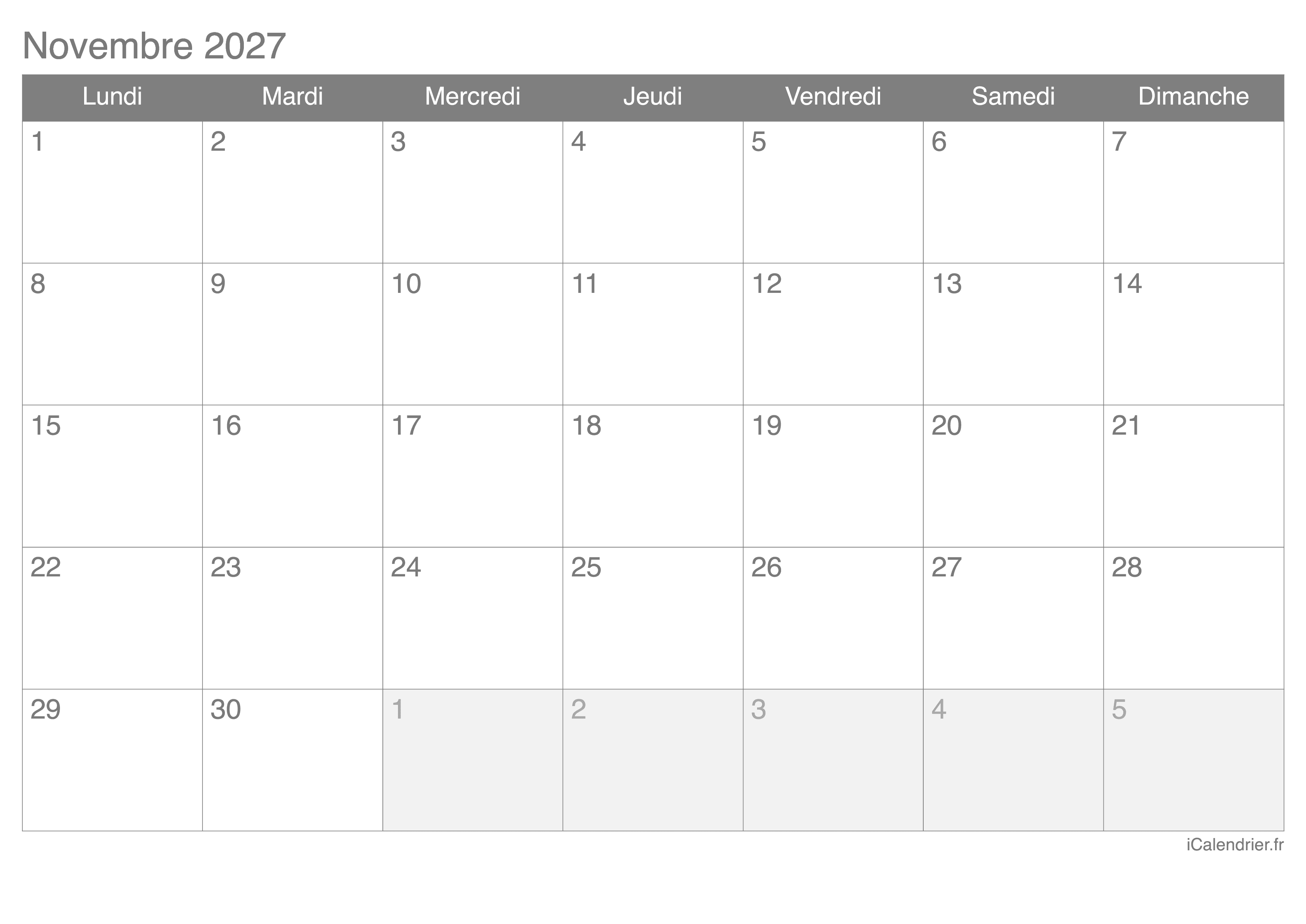 Vous pouvez télécharger et imprimer librement le calendrier de novembre 2027 vierge aux formats image, PDF et Excel. Retrouvez également d'autres thèmes de calendrier 2027 pour le mois de novembre.