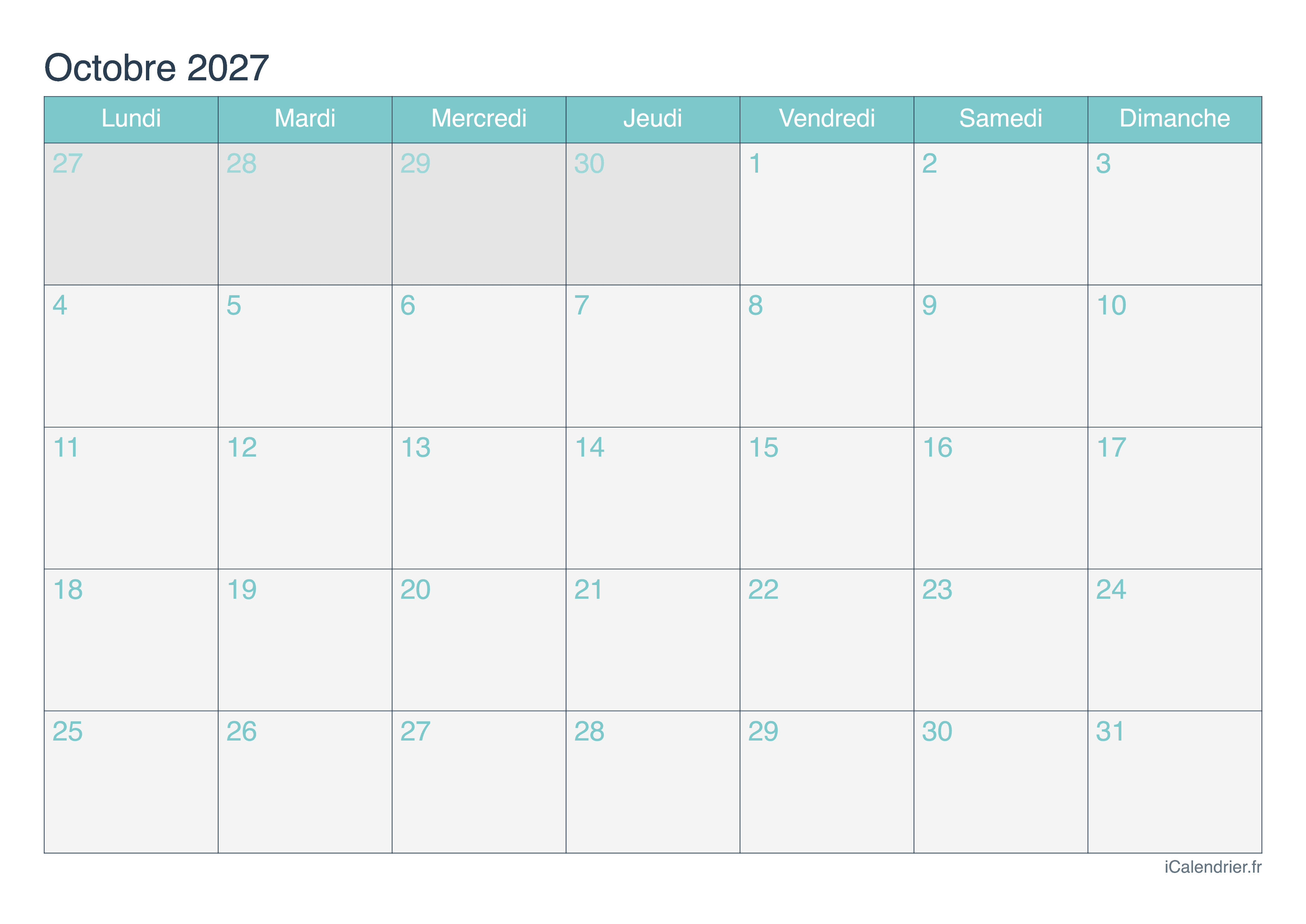 Vous pouvez télécharger et imprimer librement le calendrier d'octobre 2027 vierge aux formats image, PDF et Excel. Retrouvez également d'autres thèmes de calendrier 2027 pour le mois d'octobre.