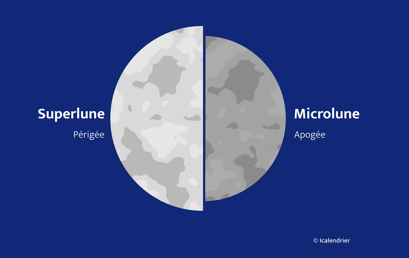 La réciproque est valable au moment de l’apogée. Le diamètre de la lune est alors environ 6 % plus petit que son diamètre moyen. Lire « Histoire de lune : la superlune », Société astronomique du Havre, 13 juillet 2023