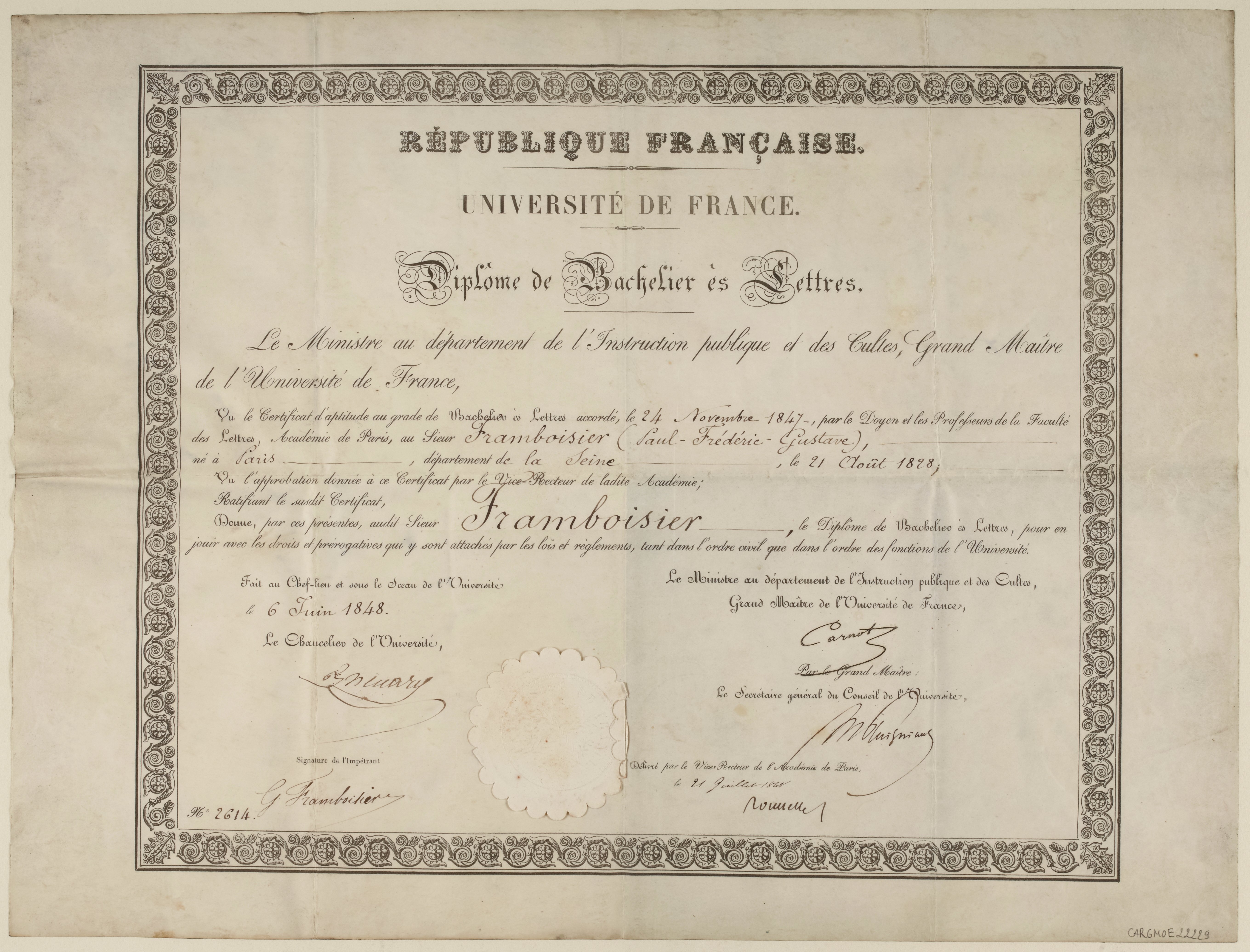 Diplôme de Bachelier ès Lettres de Julie-Victoire Daubié, établi le 7 décembre 1861.